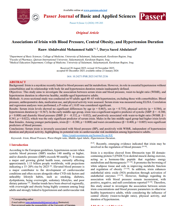 Methods: A cross-sectional study was conducted on 95 adults aged 40–65 with hypertension, excluding those with comorbidities. Blood pressure, anthropometric data, medication use, and physical activity were assessed. Serum irisin was measured using ELISA. Correlation and regression analyses were performed; a P-value of ≤ 0.05 was considered significant.